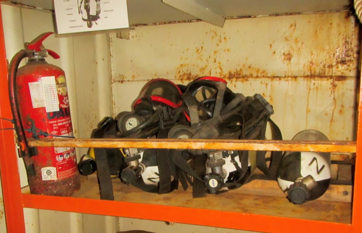 We noted two SCBA units stored in the bosun store beneath the forecastle deck—an atypical placement for such critical emergency equipment. Accompanying these were only two spare air bottles, despite SOLAS regulations calling for a minimum of two spare bottles per SCBA unit.