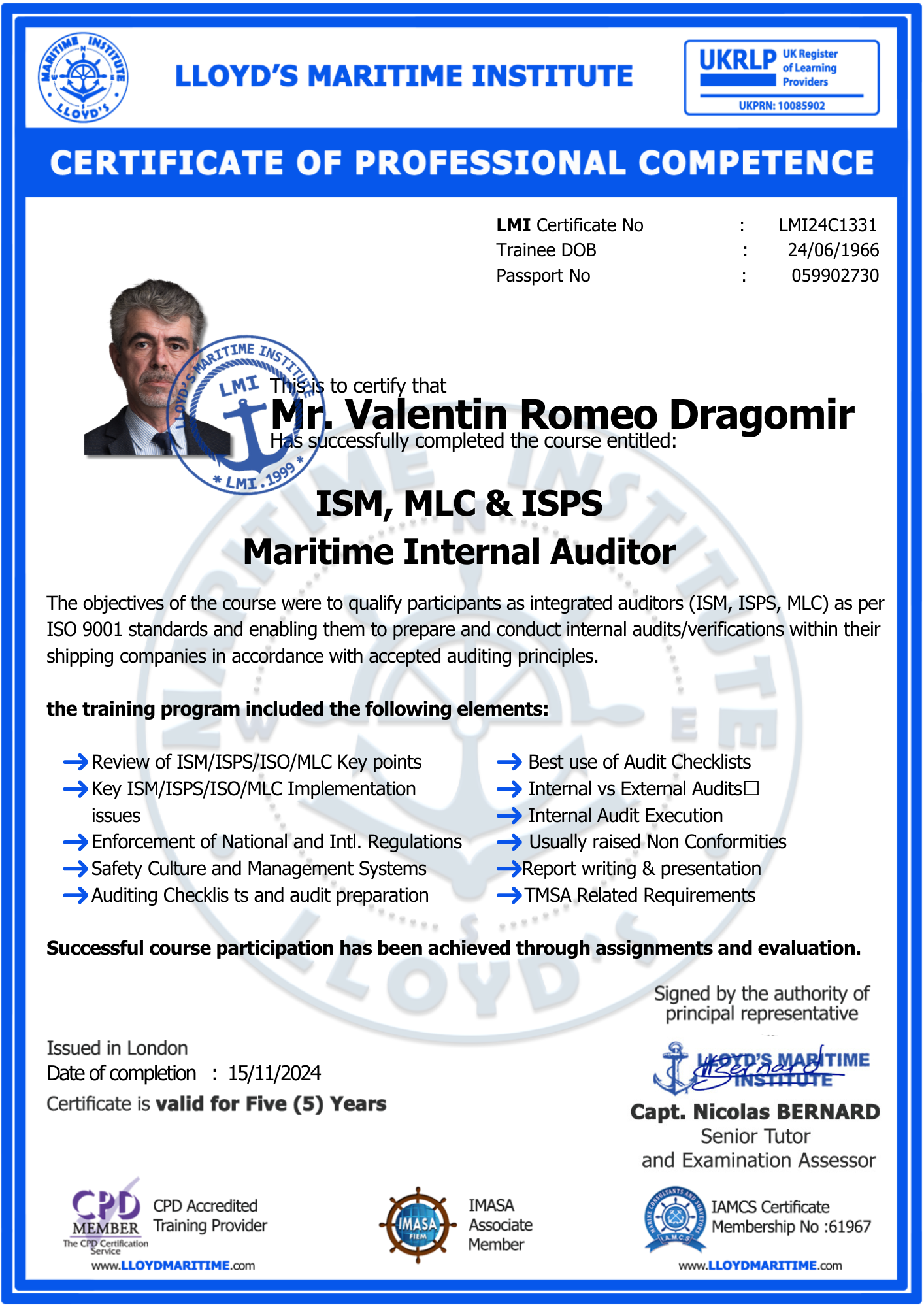 I am a naval architect with extensive experience in the shipping industry, Certified ISM/ISPSĀ internal auditor and Ultrasonic tightness test operator . I am motivated by a passion for shipping and technology, driven to provide the best possible customer experience, and committed to delivering top-notch ship inspection services. My aim is to support owners in maintaining their vessels at the highest level of compliance with required standards. My ultimate goals are achieving 100% operational readiness for both the vessel and crew in normal and emergency situations and ensuring 0% delays in operations due to non-compliances.